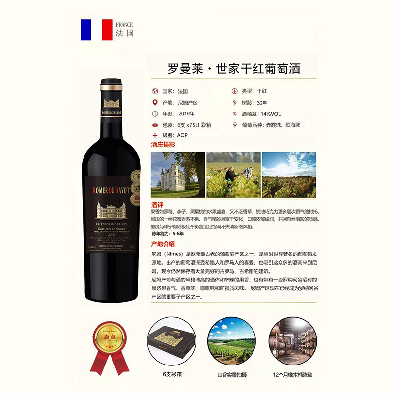 罗曼莱世家干红葡萄酒,14度,750mlx6