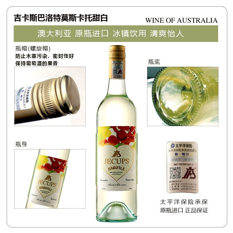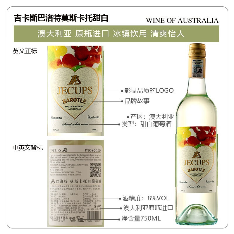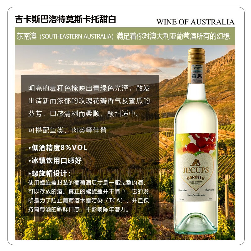 吉卡斯JECUPS 澳大利亚 巴洛特莫斯卡托甜白葡萄酒 澳洲原瓶进口 750ml*6整箱装
