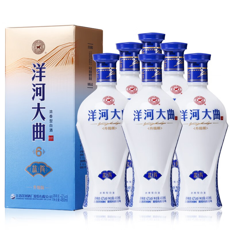 洋河大曲 蓝瓷 42度480ml纯粮酿造白酒 口感绵柔浓香型白酒 480ml*6瓶整箱 新老包装随机发货