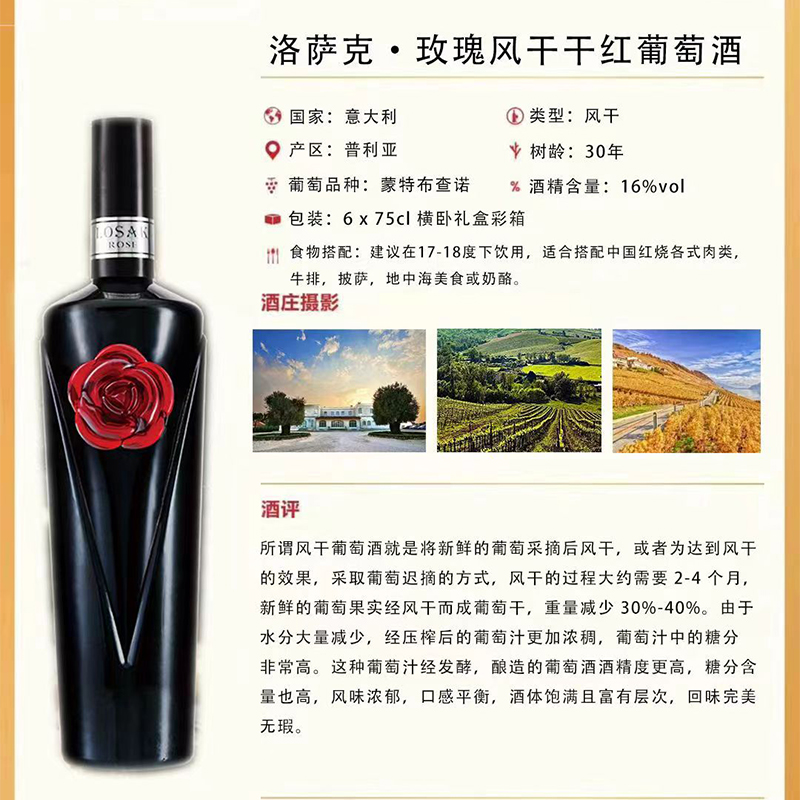洛萨克玫瑰 风干(礼盒装)意大利进口 16%VOL 75cl*6支 横卧礼盒彩箱