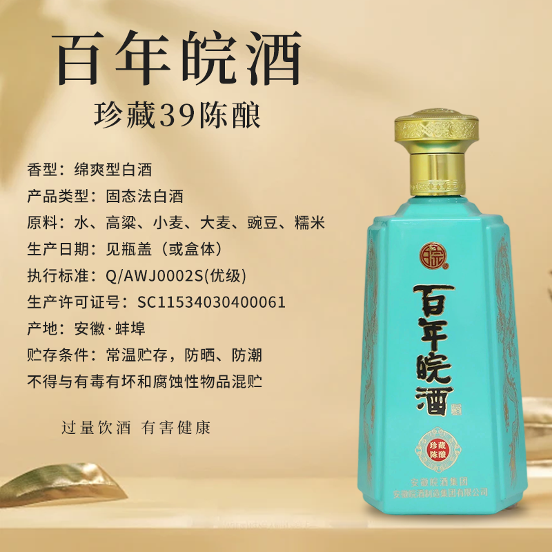 百年皖酒 珍藏39陈酿 52度 绵爽型白酒 匠心匠造 纯粮酿造 500ml*4瓶 整箱